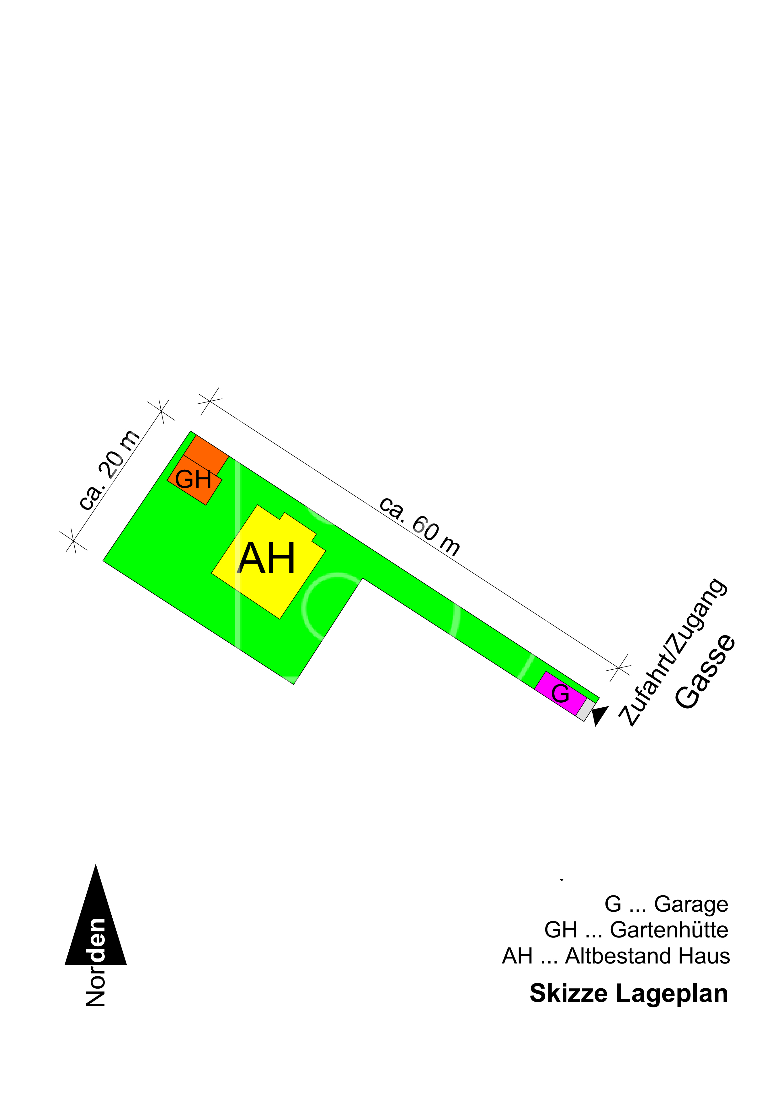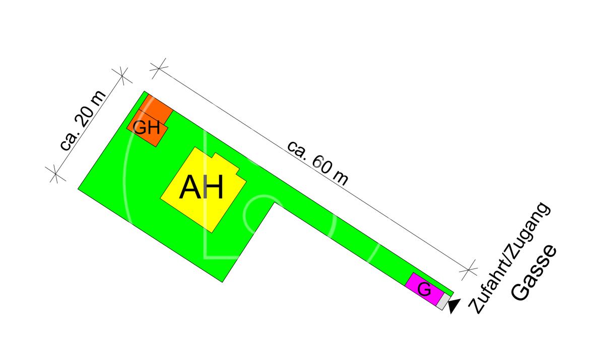 Bei der Liegenschaft handelt es sich um ein Fahnengrundstück. Die "Fahne" ist ca. 4 m breit und 33 m lang.