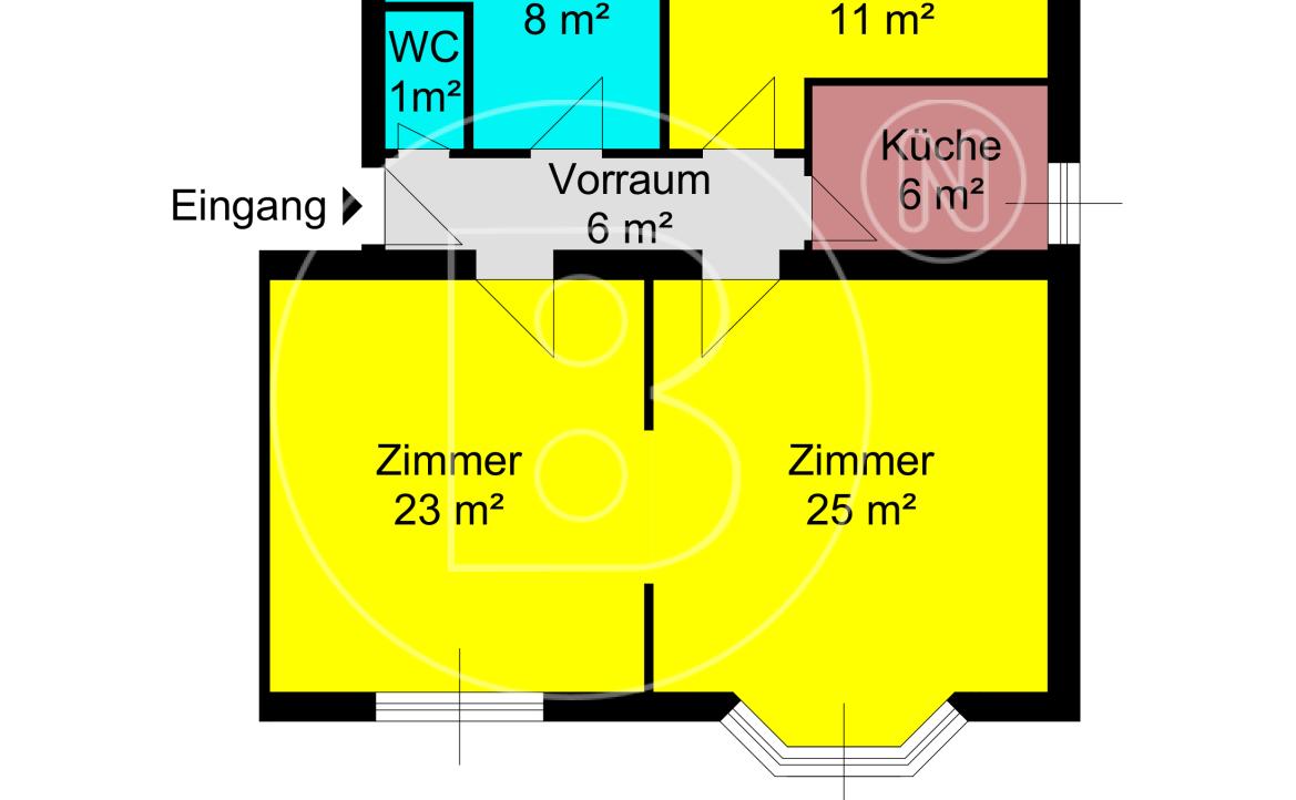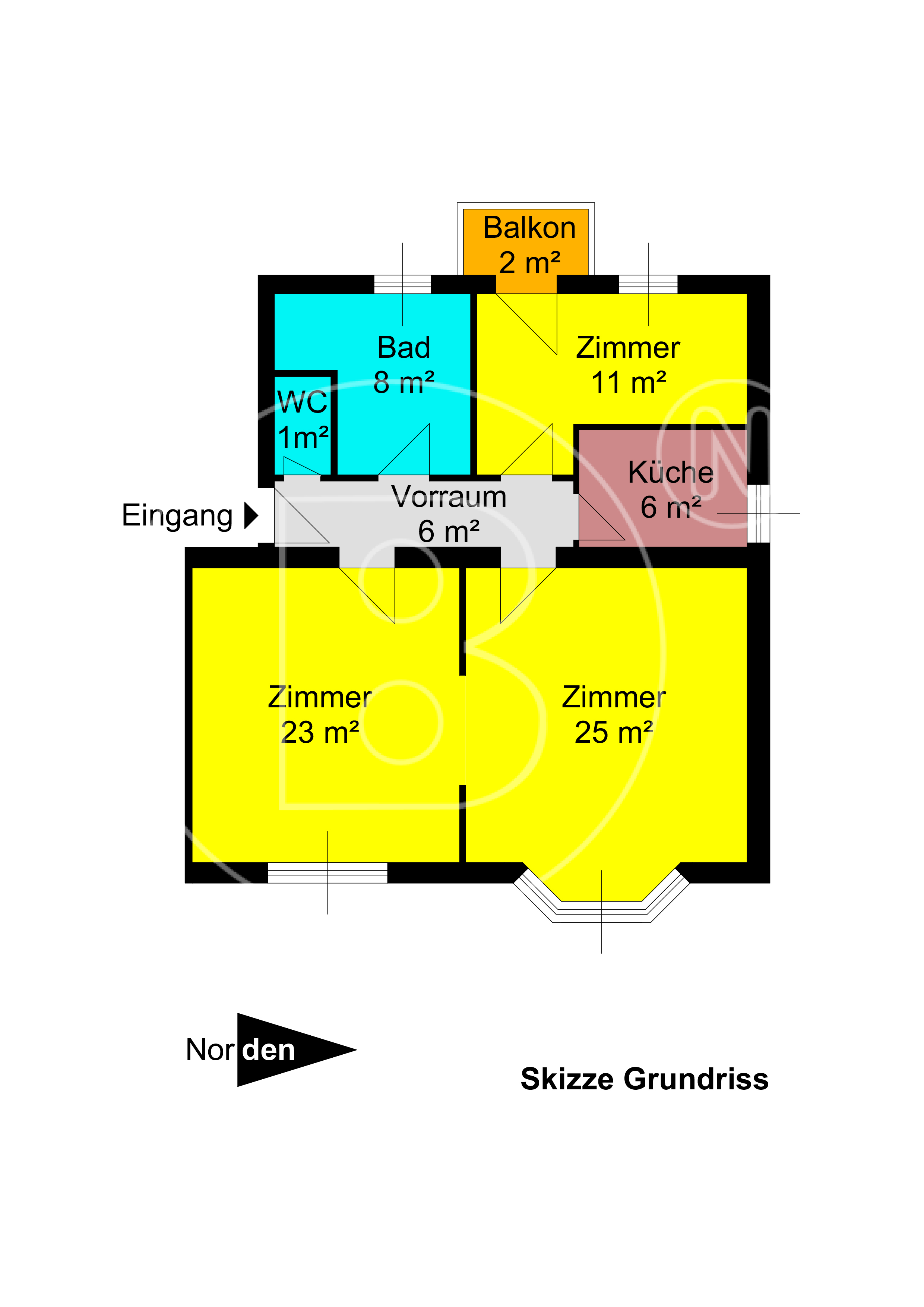 ca. 3 Meter. Grundsätzlich sind alle Räume zentral vom Flur aus begehbar. Die beiden, gassenseitig gelegenen größeren Wohnräume sind ostseitig orientiert, während das dritte Zimmer mit dem ca. 2,5 m² großen Balkon und das Badezimmer gartenseitig nach Westen ausgerichtet sind.