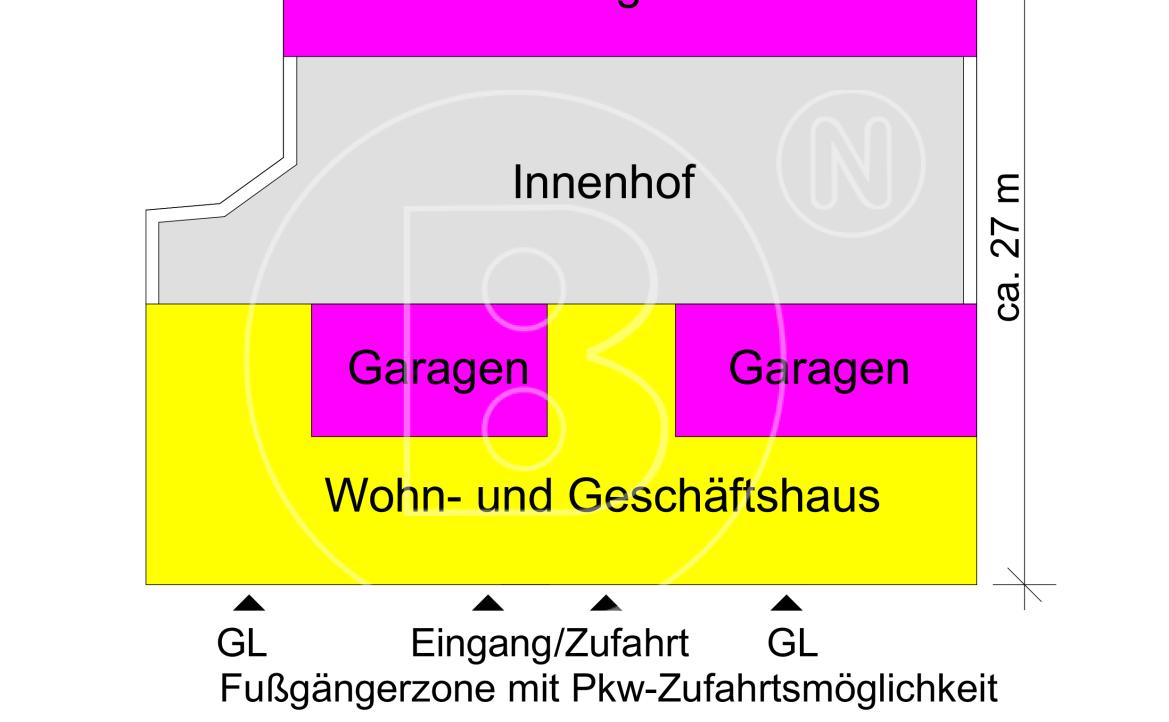 Auf dem Grundstück ist gassenseitig das Wohn- und Geschäftshaus errichtet. Die Gasse ist eine Fußgängerzone mit Pkw-Zufahrtsmöglichkeit zur Liegenschaft.