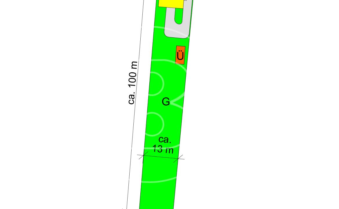 Das Grundstück umfasst ca. 1.338 m². Es hat eine Länge von ca. 100 m und eine Breite von ca. 13 m.
