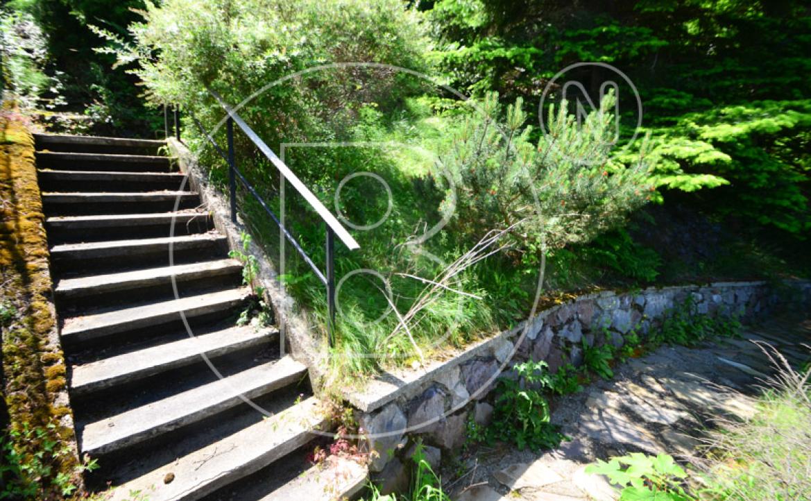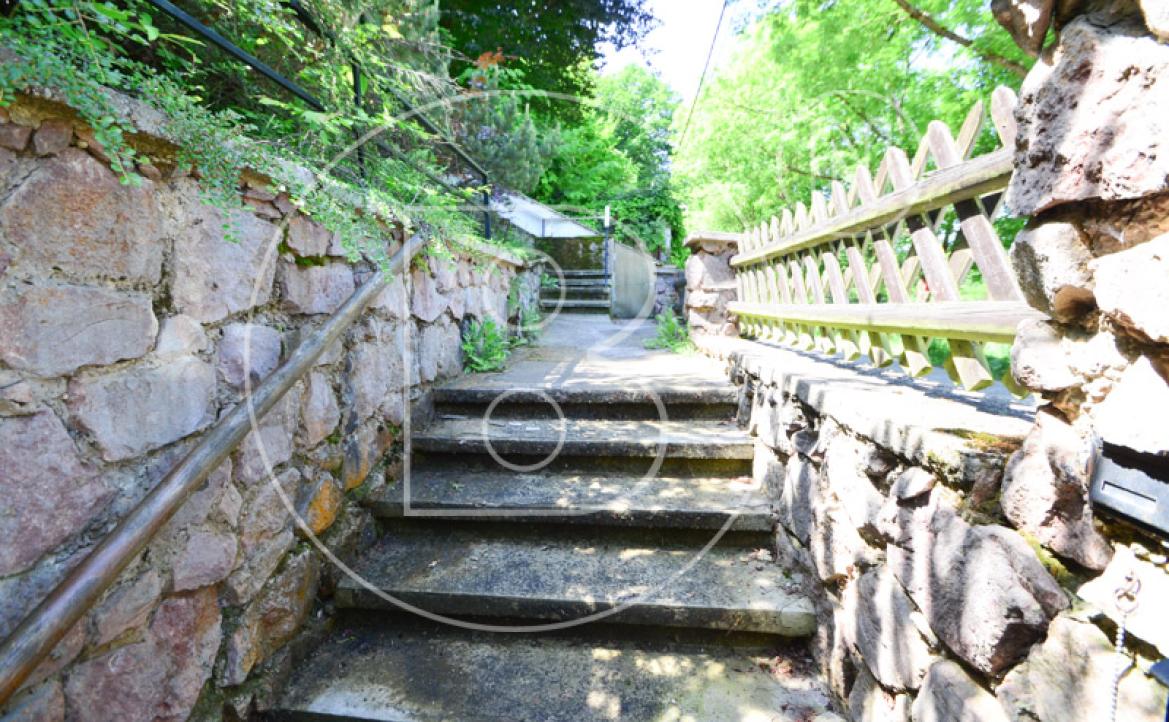 Vom Straßenverlauf aus steigt das Grundstück nach Süden stark an und ist aufgrund der Hanglage nur über einen befestigten, mit Treppen unterbrochenen Weg erschlossen.